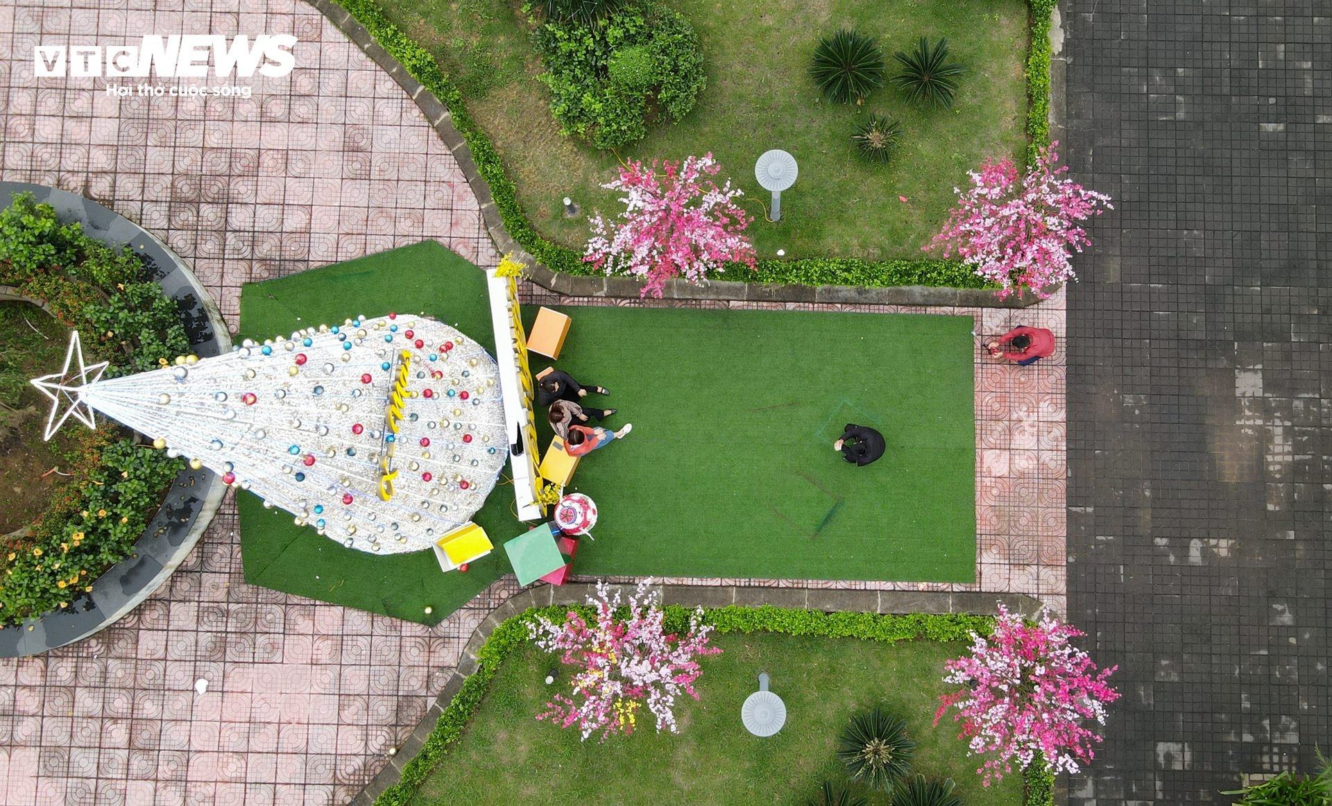Xung quanh cây thông là 4 cây đào giả được đặt đối xứng nhau tô thêm sự ấm áp trong mùa Giáng sinh.